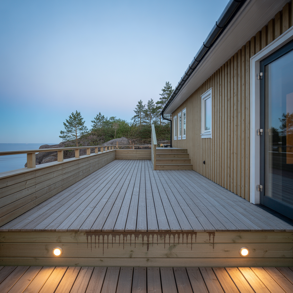 Den infällda belysningen planerades tidigt för att passa bjälklag och gångstråk. Vi använde lågvoltsspots med rätt kapslingsklass för utomhusbruk, borrade inbyggnadshål med fuktskydd och drog kablage i UV-stabil slang med diskreta genomföringar. Transformator placerades i ventilerat, skyddat läge och elarbetet utfördes av behörig installatör. Vi gjorde provdrift i skymning, justerade styrning via timer/skymningsrelä och dokumenterade grupper och effekt. Egenkontroller omfattade bl.a. fuktkvot i virke, infästningar, planhet, fall, avstånd till mark och räckeshöjder. Avslutningsvis genomfördes gemensam genomgång med beställaren, relationsunderlag och skötselråd överlämnades, och platsen lämnades ren.