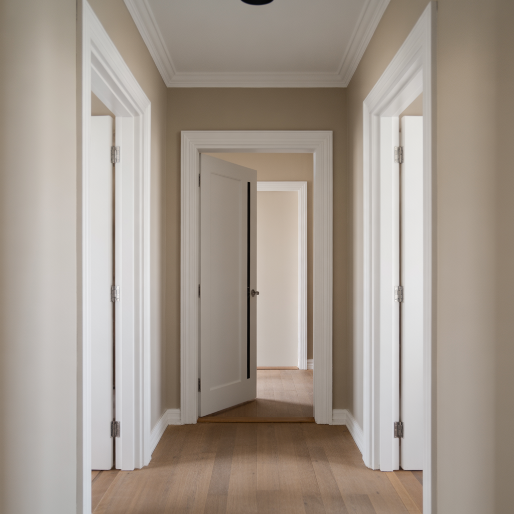 För ljudtätningen monterades nya tätningslister i EPDM runt dörrarnas anslag och trösklar justerades så att trycket mot listerna blev jämnt utan att påverka gång eller stängning negativt. I utrymmen med stengolv gjordes detta i samråd med stenläggare Täby för korrekt anslutning. Där det passade installerades släplister mot golv för att förbättra dämpningen mellan rum med olika ljudkrav, till exempel sovrum och arbetsrum. Ljudtätningen kombinerades med finjustering av gångjärn och slutbleck för att uppnå jämn spalt runt om och korrekt anläggning mot tätningsytor. Efter detta byttes dörrfoder och anslutande lister till nya profiler i målad MDF, kapade med rena snitt och montage med dold infästning. Skarv- och spikhål spacklades, fogar mot vägg tätades och ytorna ströks till en jämn finish i befintlig kulör.