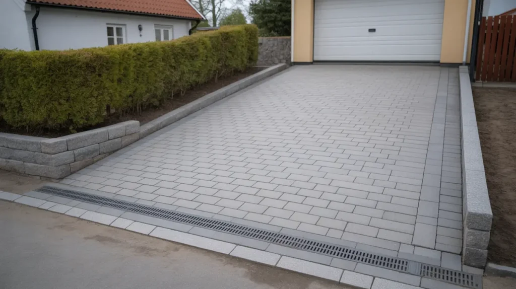 Ny stensatt uppfart med betongplattor i Gribbylund, Täby