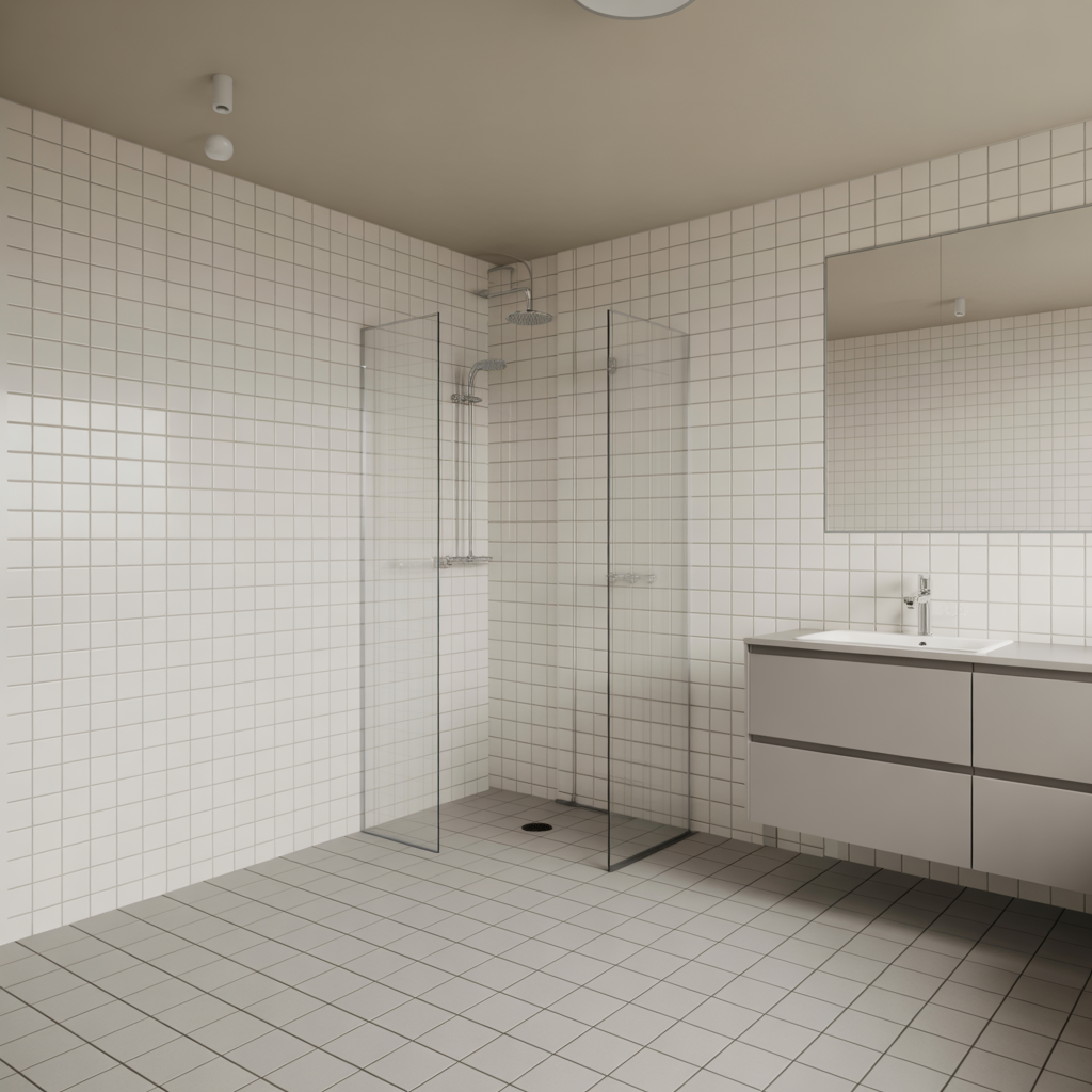 Tätskiktet utfördes som foliesystem enligt BBV och AMA Hus med primer på underlag, noggrant utförda skarvar och hörn samt manschetter vid alla rörgenomföringar och brunn. Brunnsanslutningen monterades enligt monteringsanvisning och dokumenterades med foto innan plattsättning. När egenkontrollen var godkänd påbörjades kakel- och klinkersättning med en rak och sammanhållen fogbild: väggar i matt vitt 10×30 i halvförband och golv i ljusgrå klinker 60×60. Fogning gjordes med cementbaserad fogmassa och mjukfogar lades i alla rörelsefogar och anslutningar. Efter härdning monterade vi inredning, duschvägg i klarglas samt yttre tätningsbrickor och silikonering runt genomföringar. Avslutningsvis genomfördes funktionsprov av vatten, golvvärme och avlopp, fotodokumentation sammanställdes och skötselråd överlämnades vid slutbesiktning med kund.