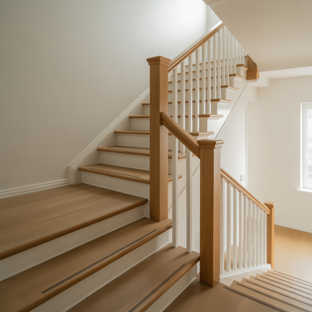 Före rivning skyddade vi golv och väggar, satte upp dammavskärmning och använde punktutsug vid slipning. De gamla slitstegen demonterades varsamt för att inte skada vangstycken; vi rätade upp mindre skevheter och kilade där det fanns spel som orsakat knarr. Nya steg tillverkades i massiv ek med tät årsring och fick acklimatiseras i huset tills fuktkvoten stabiliserats. Montering skedde med dold skruvning och fukttåligt trälim, kompletterat med limklossar underifrån för att fördela laster och dämpa ljud. Vi bytte slitna sättsteg mot målade skivor och fräste diskreta halkspår nära nosen för bättre grepp utan att störa uttrycket. Toleranser i springor och överhäng följdes upp löpande mot uppmätningarna.